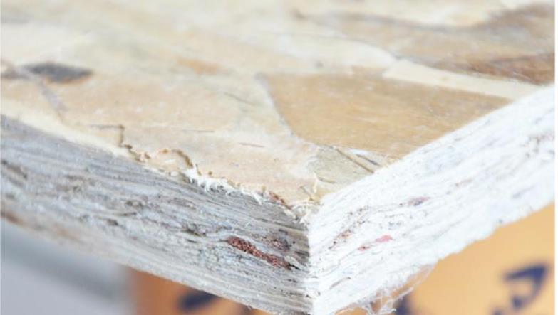 Oriented strand board (OSB), also known as flakeboard, sterling board and aspenite in British English, is a type of engineered wood similar to particle board, formed by adding adhesives and then compressing layers of wood strands (flakes) in specific orientations. It was invented by Armin Elmendorf in California in 1963.OSB may have a rough and variegated surface with the individual strips of around 2.5 cm × 15 cm (1.0 by 5.9 inches), lying unevenly across each other and comes in a variety of types and thicknesses.